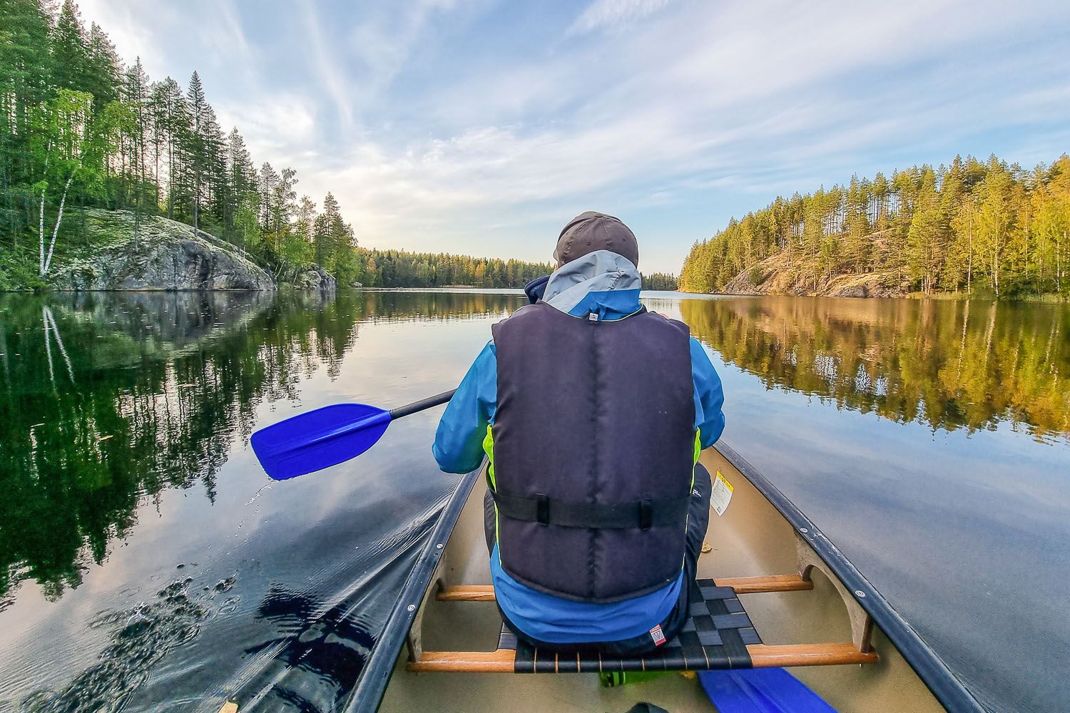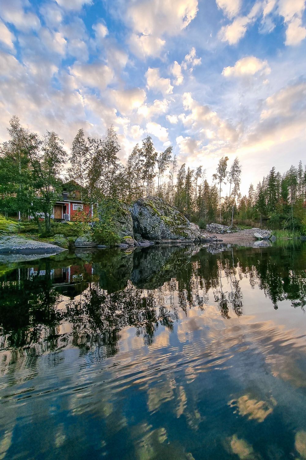 Sahanlahden sijainti on aktiviteetteja ajatellen loistava. Pari vuotta sitten fillaroimme Puumalan saaristoreittiä (60 km) perheen kanssa ja nyt lähdimme melomaan kanootilla Niskalammelta Kaitajärven suuntaan. Melottavaa olisi riittänyt 16 kilometrin matkalta, mutta pääsimme lähtemään sen verran myöhään, että jäimme seikkailemaan lähistölle. Sahanlahti Resortilta voi muuten vuokrata kanootin lisäksi e-fatbikeja, sup-lautoja, kävelysauvoja ja talvella myös lumikenkiä.