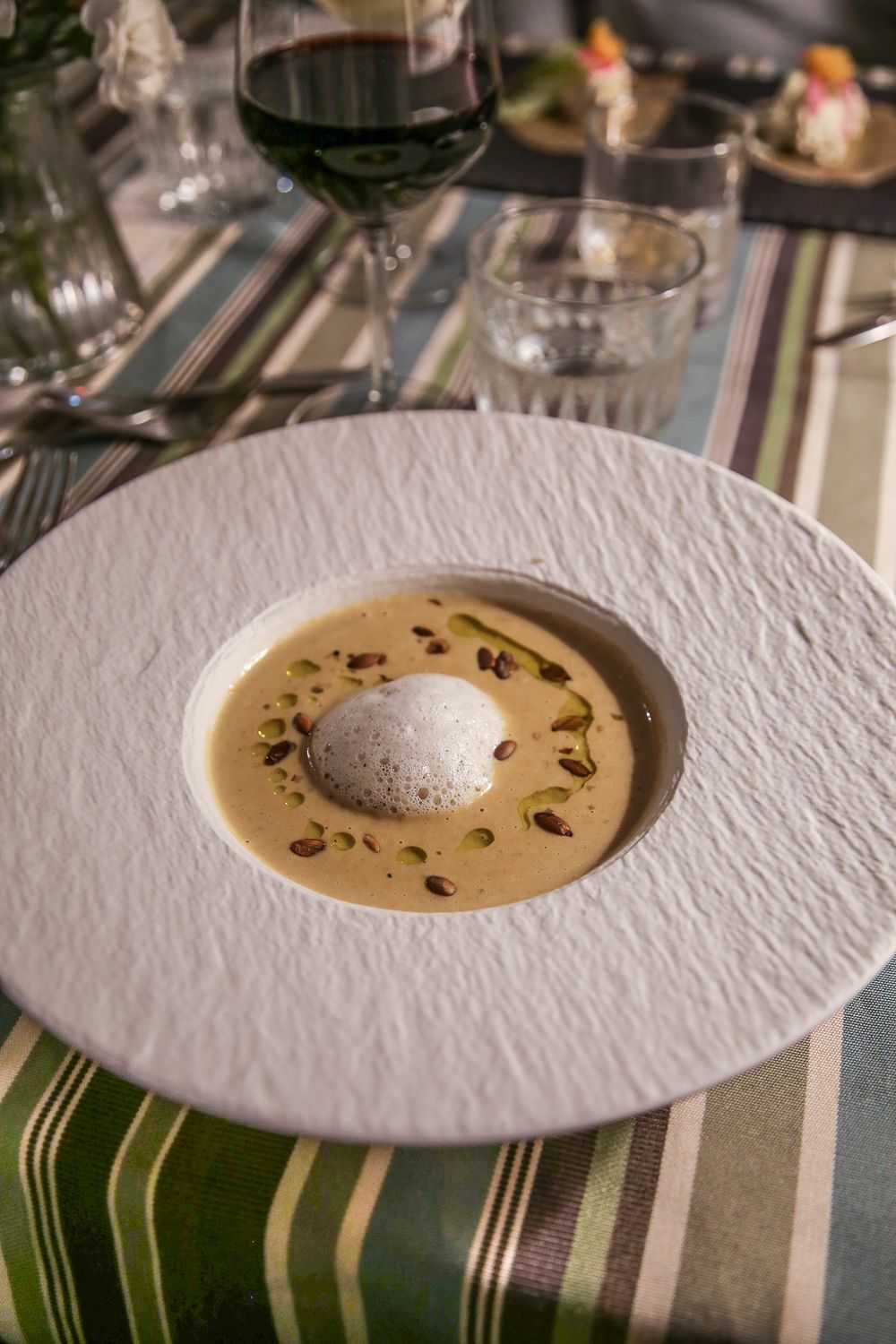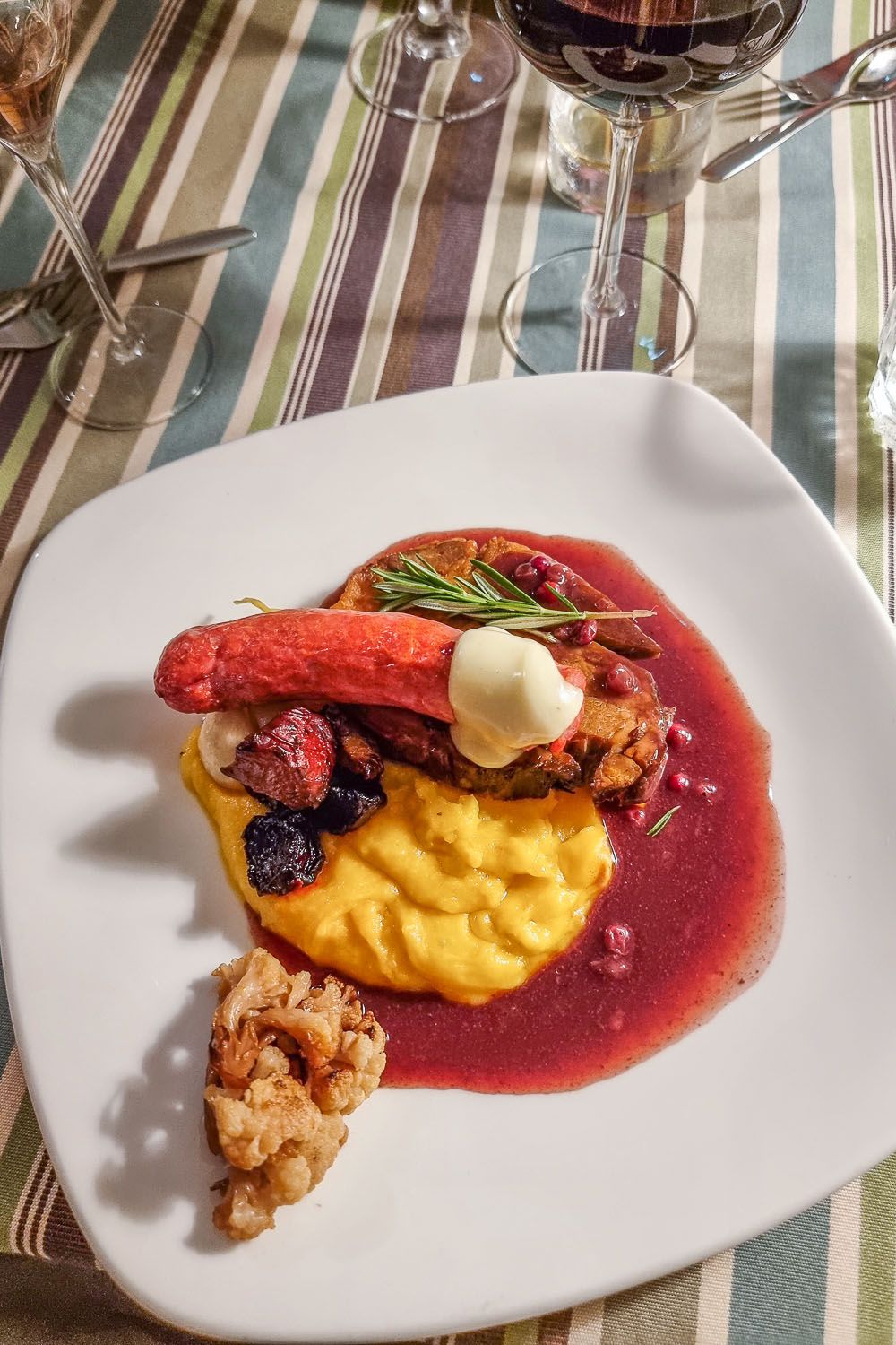 Timppa valitsi alkuun Sahanlahden sultsinoita ja Puumalan kirjolohta (12 e). Itse päädyin täyteläiseen metsäsienikeittoon (11 e). Pääruoaksi söimme molemmat Kaartilan tilan mallaspossua ja Maalaispuodin makkaraa juures-perunapyreen, kasviksien, puolukkakastikkeen ja aiolin kera (29 e). Annos oli hyvä mutta melkoisen tuhti. Jos nyt menisin Sahanlahteen uudestaan, valitsisin sadonkorjuuohraton tai lohisalaatin. Omenahyve (13 e) oli sen sijaan jälkkärinä ihanan kevyt ja raikas illallisen päättäjä.