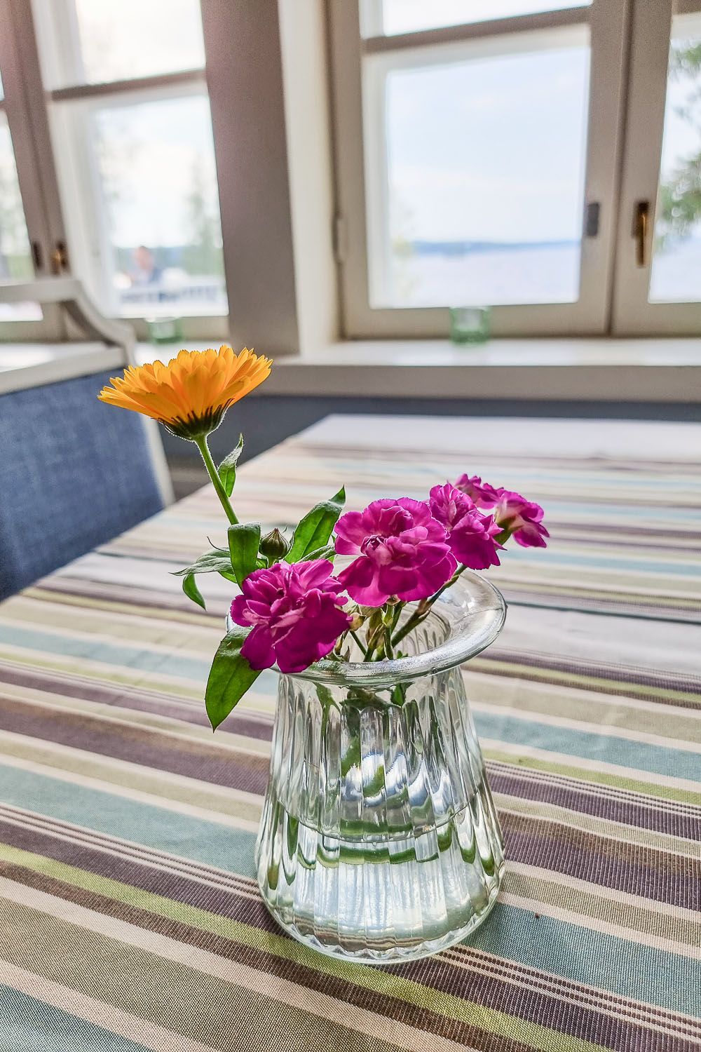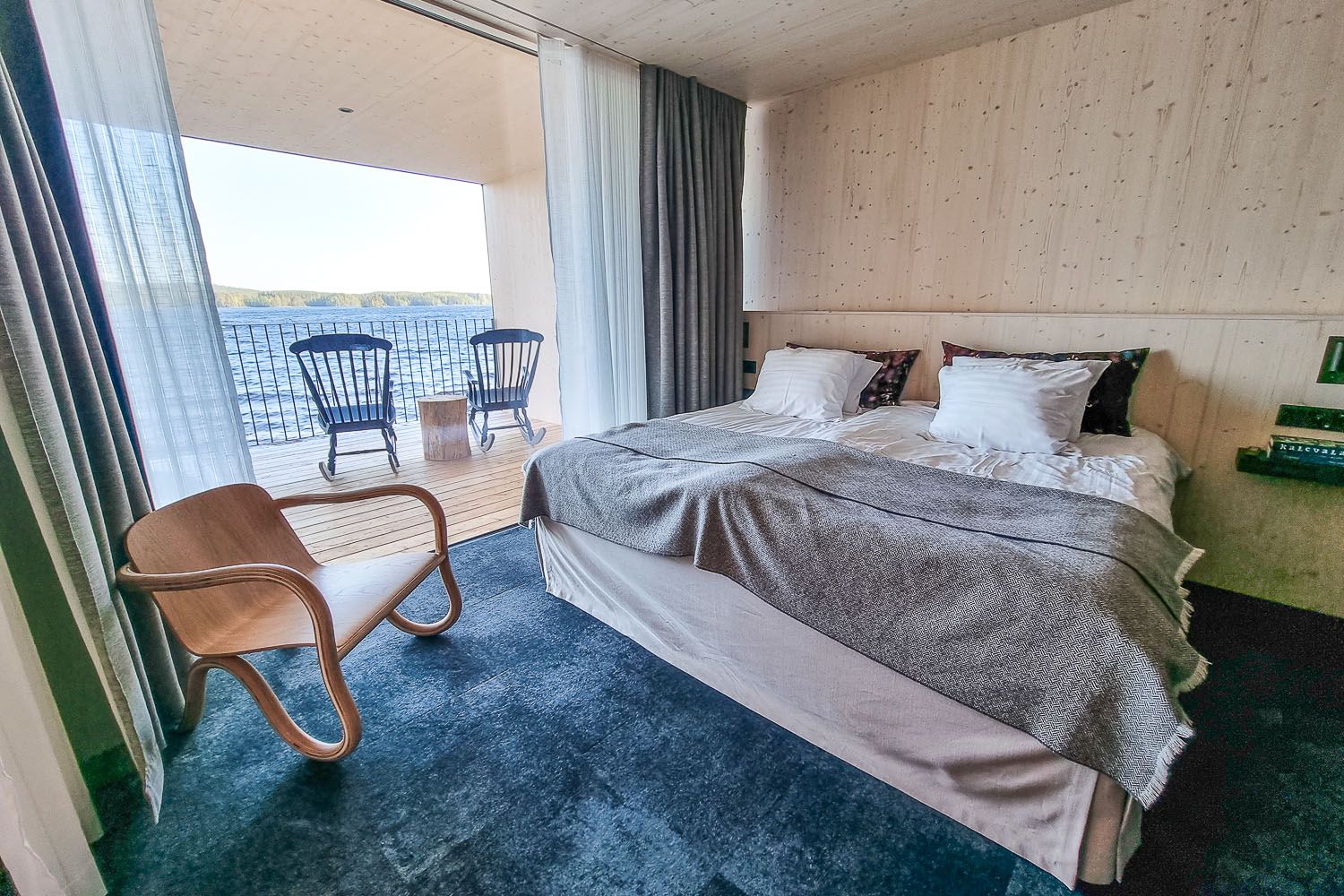 Huoneistot ovat kooltaan 37,5 neliötä ja valtaosin yhtä avaraa tilaa eli tänne mahtuu mainiosti isompienkin pakaasien kanssa. Katseenvangitsijana on päädyn seinänkokoinen ikkuna, josta avautuu näkymä suoraan järvelle. Verhoja pidimmekin koko ajan auki, sillä sängyssä pötkötellessä oli kiva tähyillä vastarannalle. Erityisen rentouttavaa oli, kun avasimme terassin ison oven niin, että laineiden liplatus kuului sisälle. Vesielementin ansiosta välillä tuntuikin aivan siltä kuin olisimme olleet laivassa. Tosin aamulla myös pimennysverhot tulivat tarpeeseen, sillä heräsin siihen, että aurinko mollotti suoraan sisään.