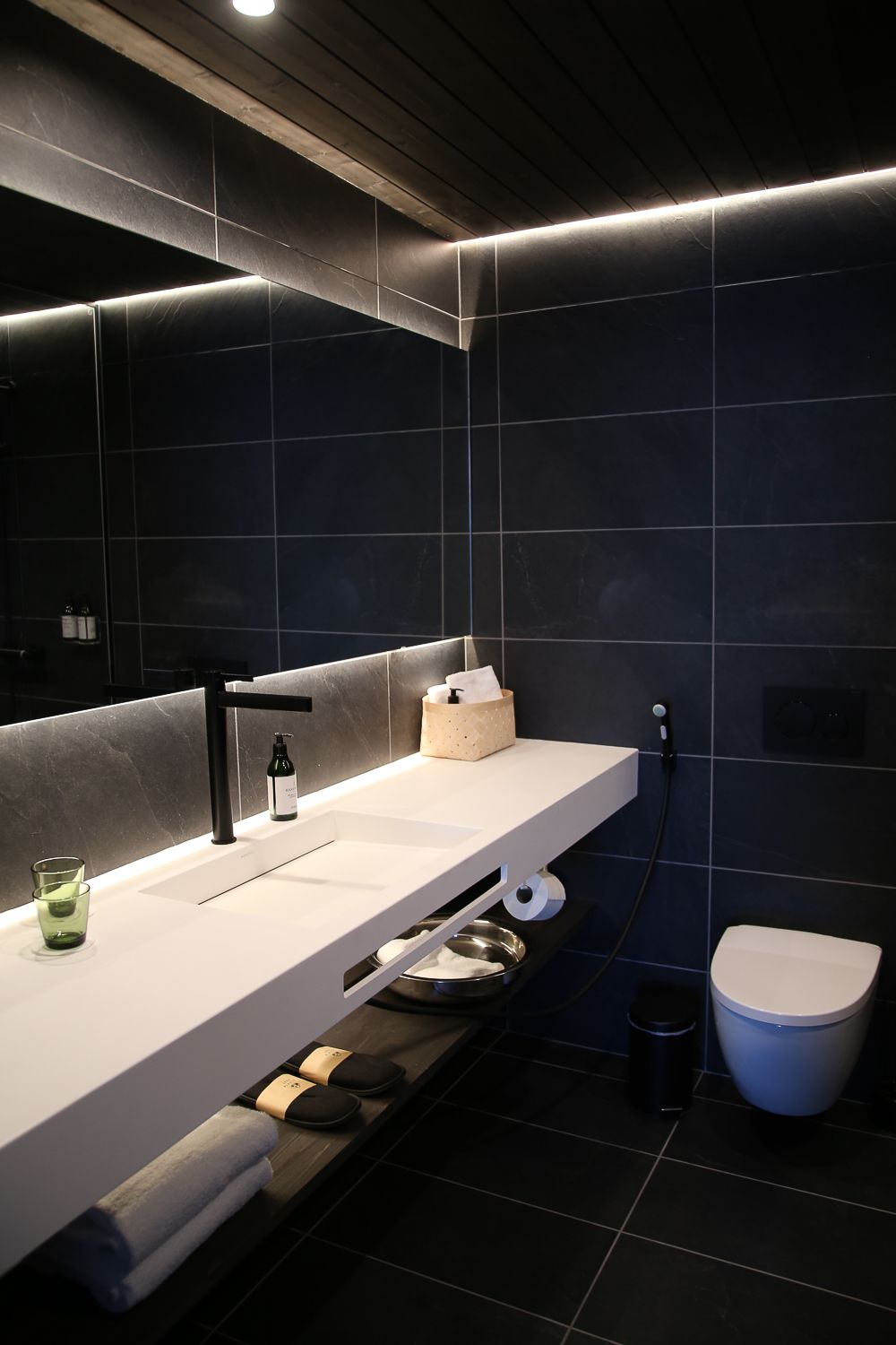 Jos huoneistot ovat pääväritykseltään vaaleita, kylppäriä ja saunaa hallitsevat tummat sävyt. Saunasta näkee ikkunan läpi huoneeseen ja ulos asti eli lauteilla istuessa voi nautiskella myös Saimaasta. Kiukaan lämpenemistä ei tarvinnut odotella, vaan se oli heti valmis.