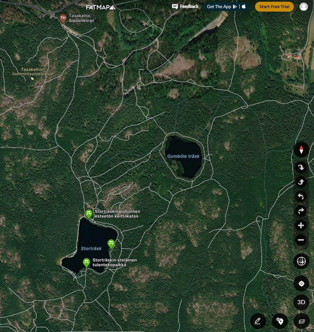 Kansallispuiston sivuilta löytyvä kartta näyttää yleensä vain pääreitit, mutta retkeilijöille tarkoitetuissa sovelluksissa (mm. Gaia gps, Karttaselain ja Fatmap) polut ja korkeuserot näkyvät paljon tarkemmin. Meillä oli tänään käytössä Fatmap, koska tulimme ladanneeksi sen Itävallan Lechin laskettelureissua varten. Hyvin pelitti sama sovellus Sipoonkorvessakin ja jestas, miten paljon tutkimattomia polkuja kartalta löytyi. Tässähän riittää patikoitavaa koko vuodeksi.
