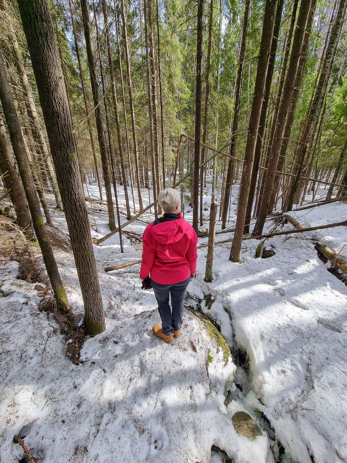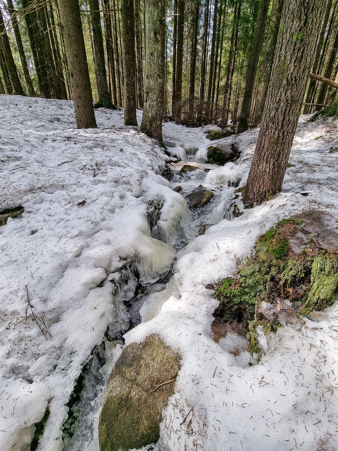 Tykkään maastoista, joissa on korkeuseroja ja maisemallista vaihtelevuutta. Tähän tarkoitukseen Tasakalliolta lähtevä reitti on omiaan. Gumbölen jälkeen tulimme jylhään rinteeseen, jonka railoissa ja halkeamissa solisi kevään ääni: jäämuodostelmien välistä ryöppyävä vesi.