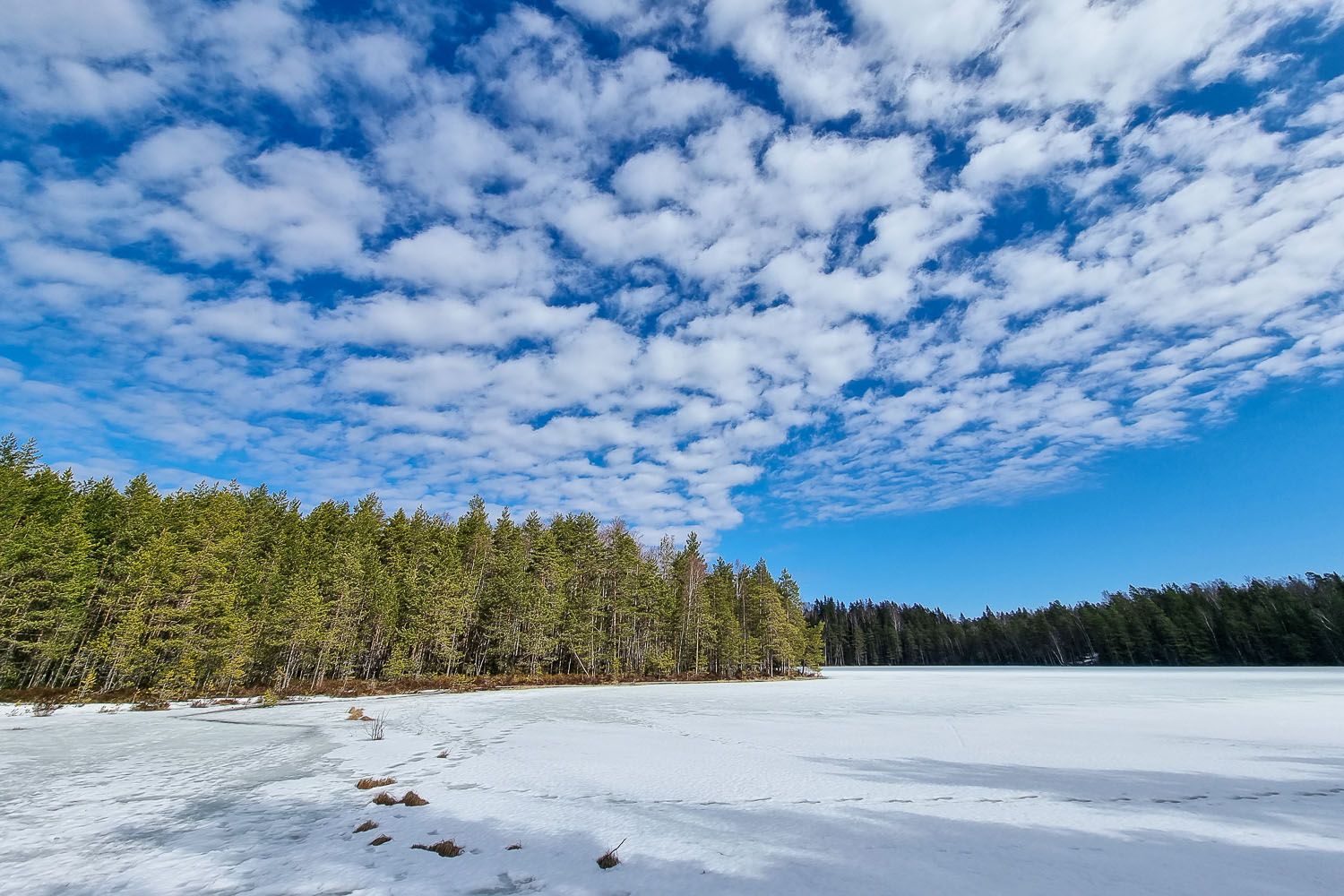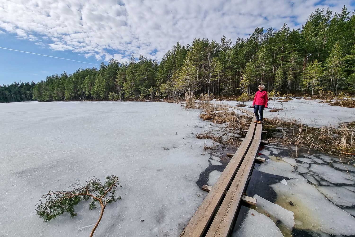 Tasakalliosta lähtevä merkitty reitti vei ensin 4,5 hehtaarin kokoisella Storträskin järvelle, jossa aurinko loisti kilpaa jääpeitteen kanssa. Täällä pääsee muuten kulkemaan kilometrin alkuetapin myös lastenvaunuilla tai pyörätuolilla, ja reitti onkin merkitty esteettömäksi. Tosin sääolosuhteet vaikuttavat reitin kuntoon.
