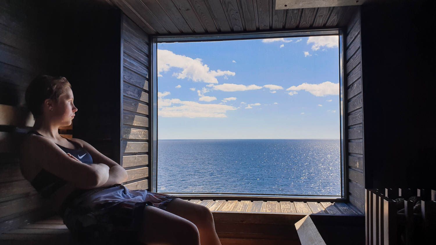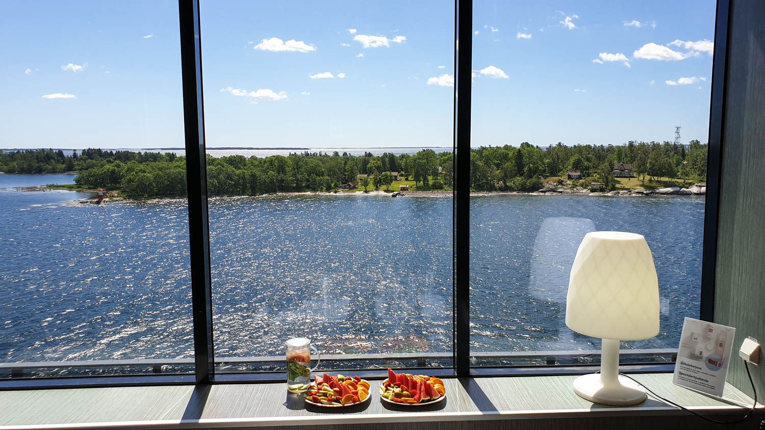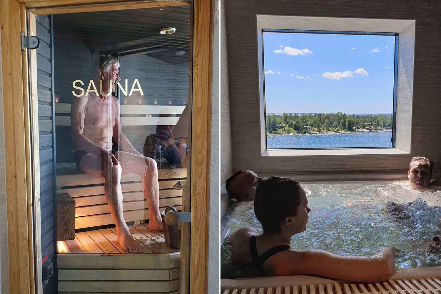 Iltaristeilyllä varsinainen ohjelma kannattaakin jättää suosiolla paluumatkaan. Me varasimme seurueen käyttöön Viking Gracen VIP-saunatilan (kaksi tuntia kuudelta henkilöltä 240 € ja kahdesta lisähenkilöstä 24 € per nenä). Pakettiin kuuluu oma näköalasauna, poreallas, kylpytakit ja pyyhkeet, sekä pullo kuohuviiniä. VIP-saunojat pääsevät myös Spa & Wellness -osaston puolelle, josta löytyy lisäksi höyrysauna ja lumiluola. Koko seurue oli yhtä mieltä siitä, että saunominen oli risteilyn paras juttu. Gracen spa on jo näköalojen vuoksi ruotsinlaivojen hulppeimmasta päästä: kylpylään tulvii valoa suurista ikkunoista ja poreammeessa löhöillessä voi nauttia ohi lipuvasta saaristosta. Kivointa oli tietysti huomata, että päivänsankari aidosti ja oikeasti viihtyi.
