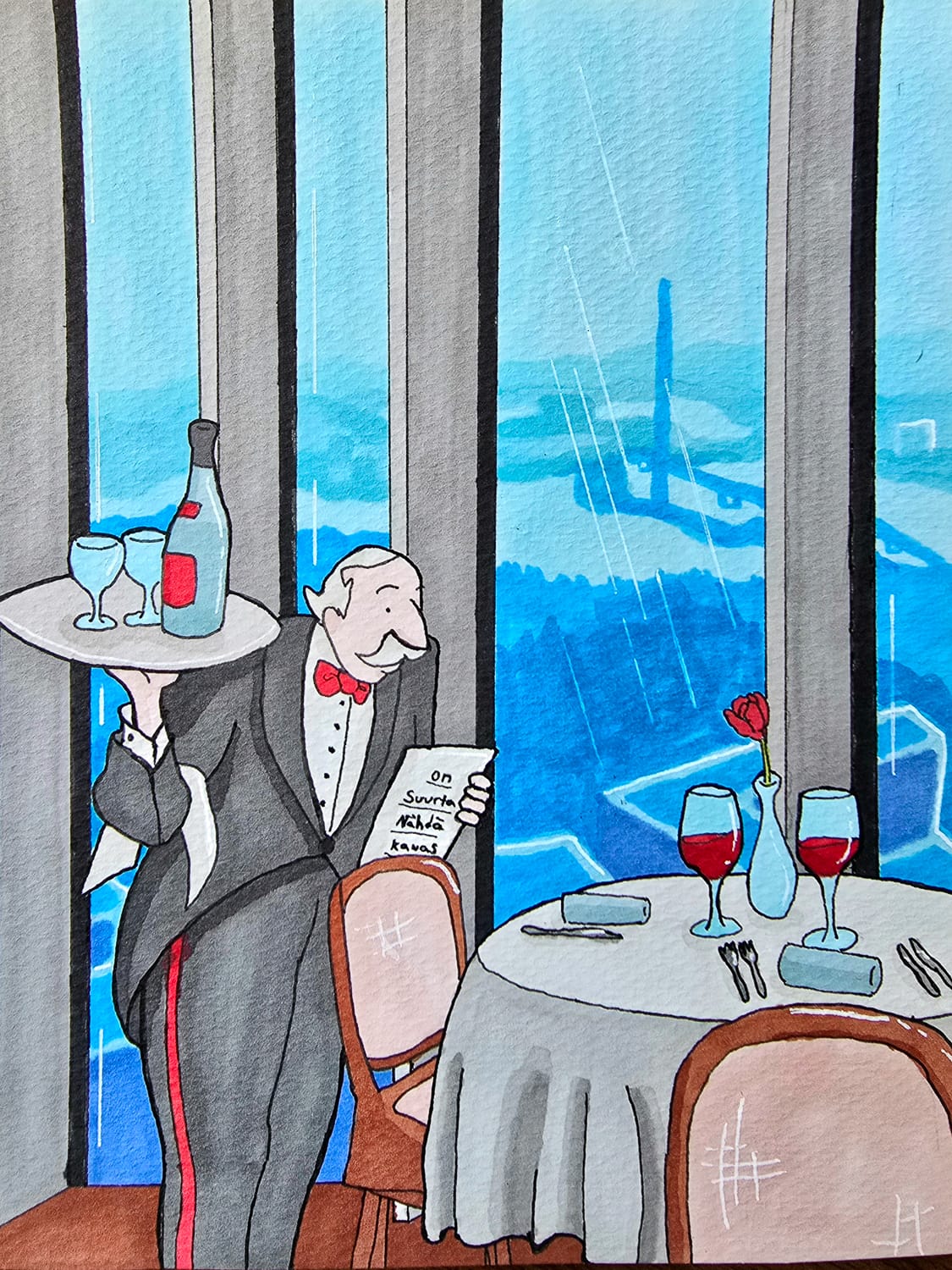 Meillä on ollut Timpan kanssa jo pitkään tapana suosia elämyslahjoja. Usein vielä niin, että niihin liittyy jokin yllätys (Istanbul nevöfoget!). Lokakuussa sain perheeltä tuon Annin piirtämän mielettömän hienon kortin, johon sisältyi vihje.