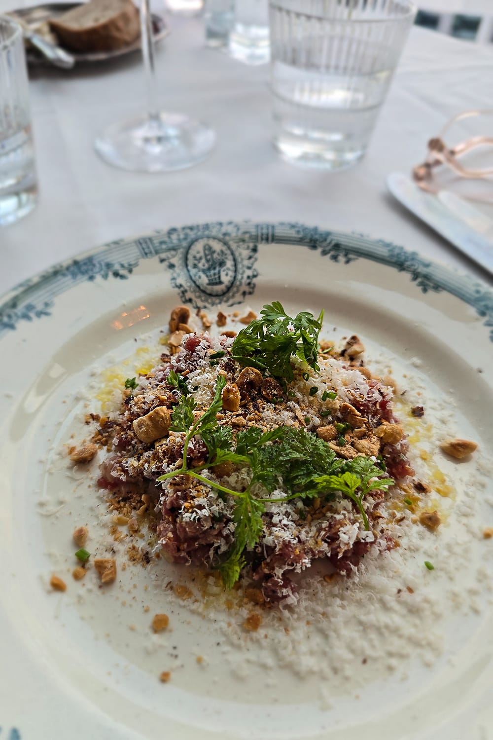 BisouBisoun menu on kiva yhdistelmä rentoja ja juhlavampia annoksia. Niitä voi tilata erikseen tai 3–5 ruokalajin settinä. Me valitsimme neljän ruokalajin yllätyspaketin. Peli käynnistettiin tartarilla, parmesanilla ja paahdetulla hasselpähkinällä. Ehkä paras tartar, jota olen syönyt Suomessa! Annos oli juuri passelin kokoinen ja täydellisesti maustettu.