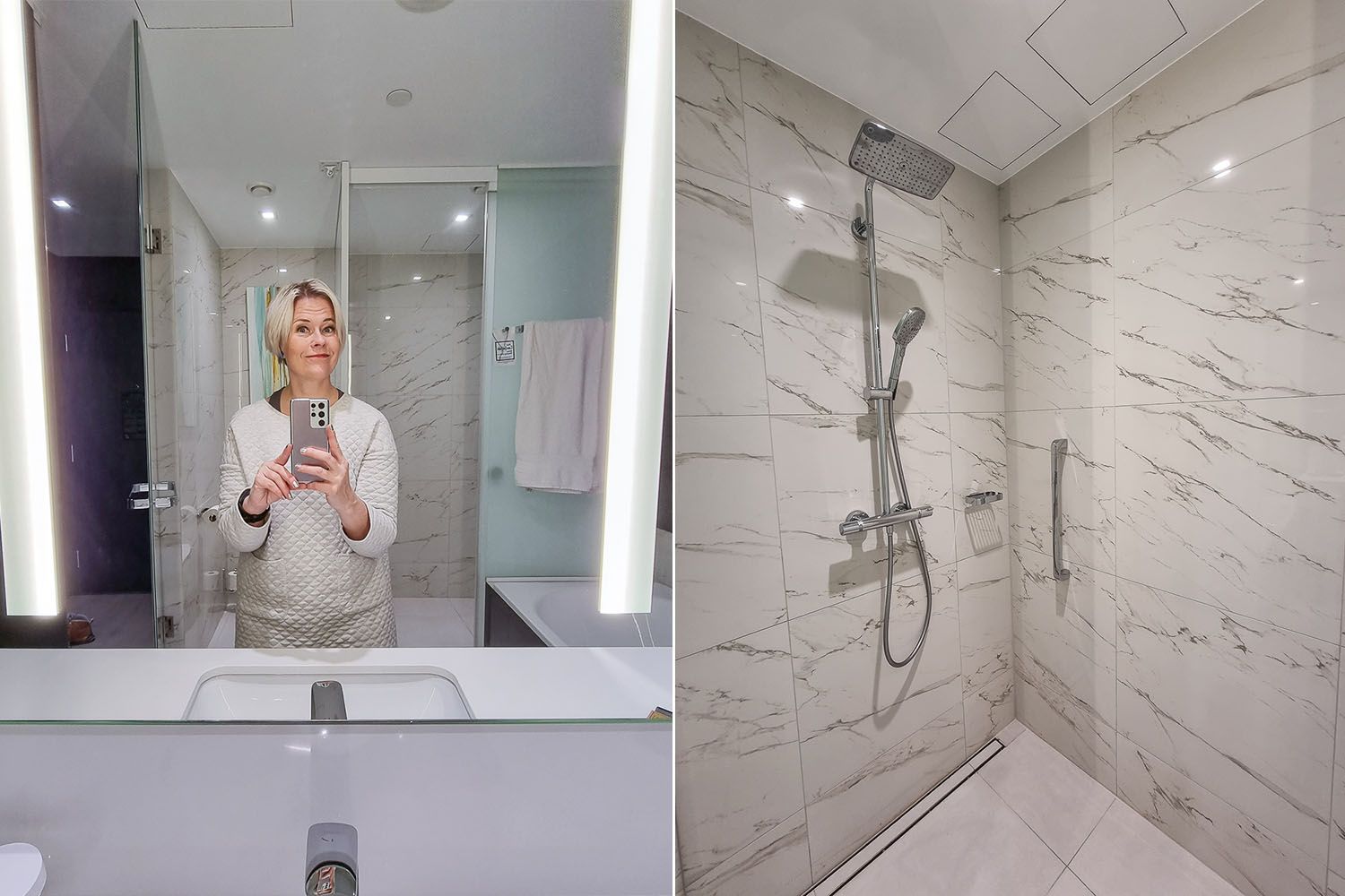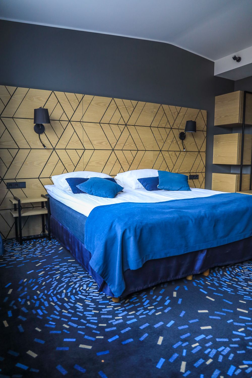 Hilton Tallinn Park valmistui Tallinnaan jo 7 vuotta sitten, mutta minulle tämä oli uusi tuttavuus. Googlatessa hokasin, että rakennuksen sisustus on suomalaisen Dsign Vertti Kiven käsialaa. Huono puoli on, että hotelli sijaitsee hiukan syrjässä ja hankalassa suunnassa keskustaan nähden. Raatihuoneen torilta on tänne 20 minuutin kävelymatka. Hotellin tyylikkyyden ja palvelujen vuoksi olen valmis kyllä sijainnista tinkimäänkin. Sisustuksessa on hyödynnetty paljon kiiltäviä pintoja, geometrisiä kuvioita ja innovatiivisia valaistusratkaisuja. Värit ovat ylellinen kombinaatio vaaleaa, beigeä, kultaa ja mustaa. Ymmärrän hyvin, minkä vuoksi hotelli palkittiin vuonna 2019 International Property Awardseissa Lontoossa.