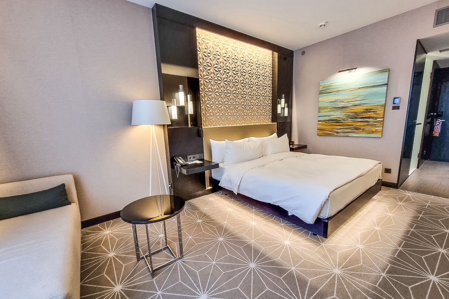 Hotellissa on kaikkiaan 11 kerrosta, itse yövyin muistaakseni 6. tai 7. kerroksessa. King Deluxe -huoneeni oli todella tilava, arviolta hiukan alle 30 neliötä. Värimaailma jatkoi hienosti hotellin muuta linjaa ja valaistus oli todella kaunis täälläkin. Tykkäsin erityisesti tuosta sängynpäädyn kullanhohtoisesta koristeseinästä. King size -sängyssä olisi mahtunut koisimaan vaikka poikittain. Erityiskiitos hyvistä patjoista ja muhkeista tyynyistä.