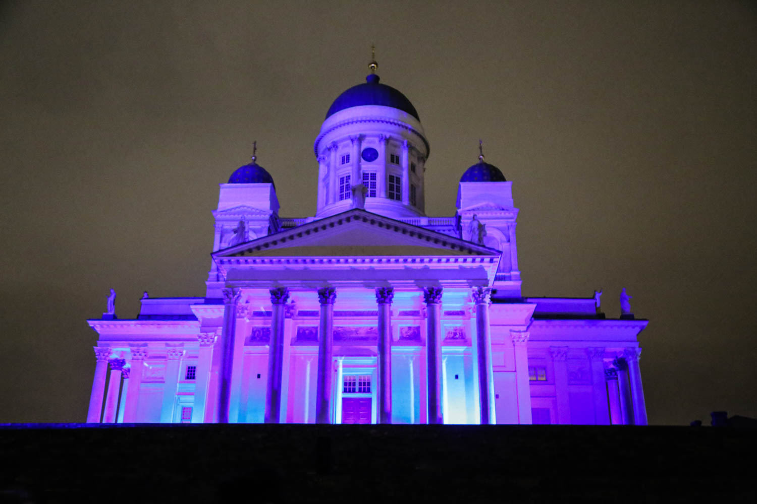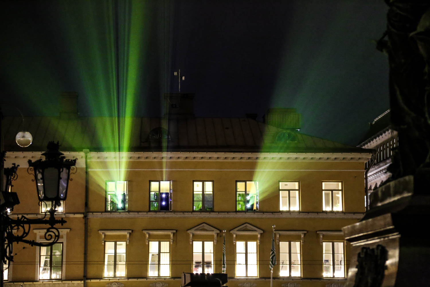 Tuomiokirkko valaistaan vastapäisestä Kiseleffin talosta.