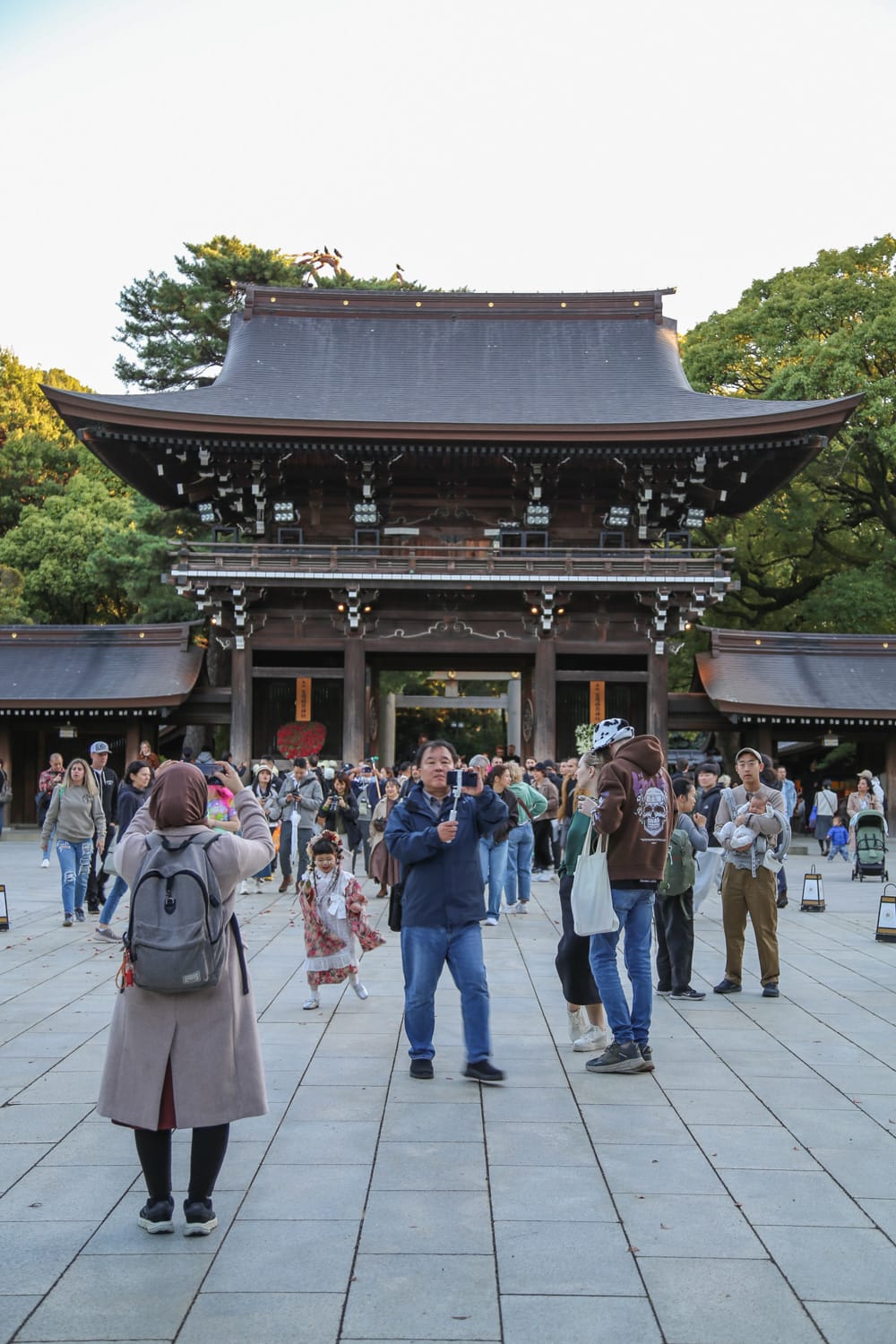 Yoyogista oli kätevä jatkaa matkaa Tokion suurimpaan ja suosituimpaan shintopyhäkköön, Meiji Jingūun, sillä se sijaitsee vain reilun parin kilometrin päässä puistosta. Temppeliä ympäröi kahdeksan torii-porttia, joiden läpi kulkiessa noudatetaan tarkkoja rituaaleja. Perussääntö on, että torii-porttien edessä kumarretaan kevyesti, jonka jälkeen portin ali kuljetaan oikealta puolelta sisälle ja lähtiessä vasemmalta puolelta ulos. Shintolaisen etiketin mukaan keskiosa on varattu jumalille. Vuosien 1915–1920 aikana rakennettu pyhäkkö on omistettu keisari Meijille ja keisarinna Shokenille, jotka muuttivat aikanaan Japanin yhteiskuntaa modernimmaksi.