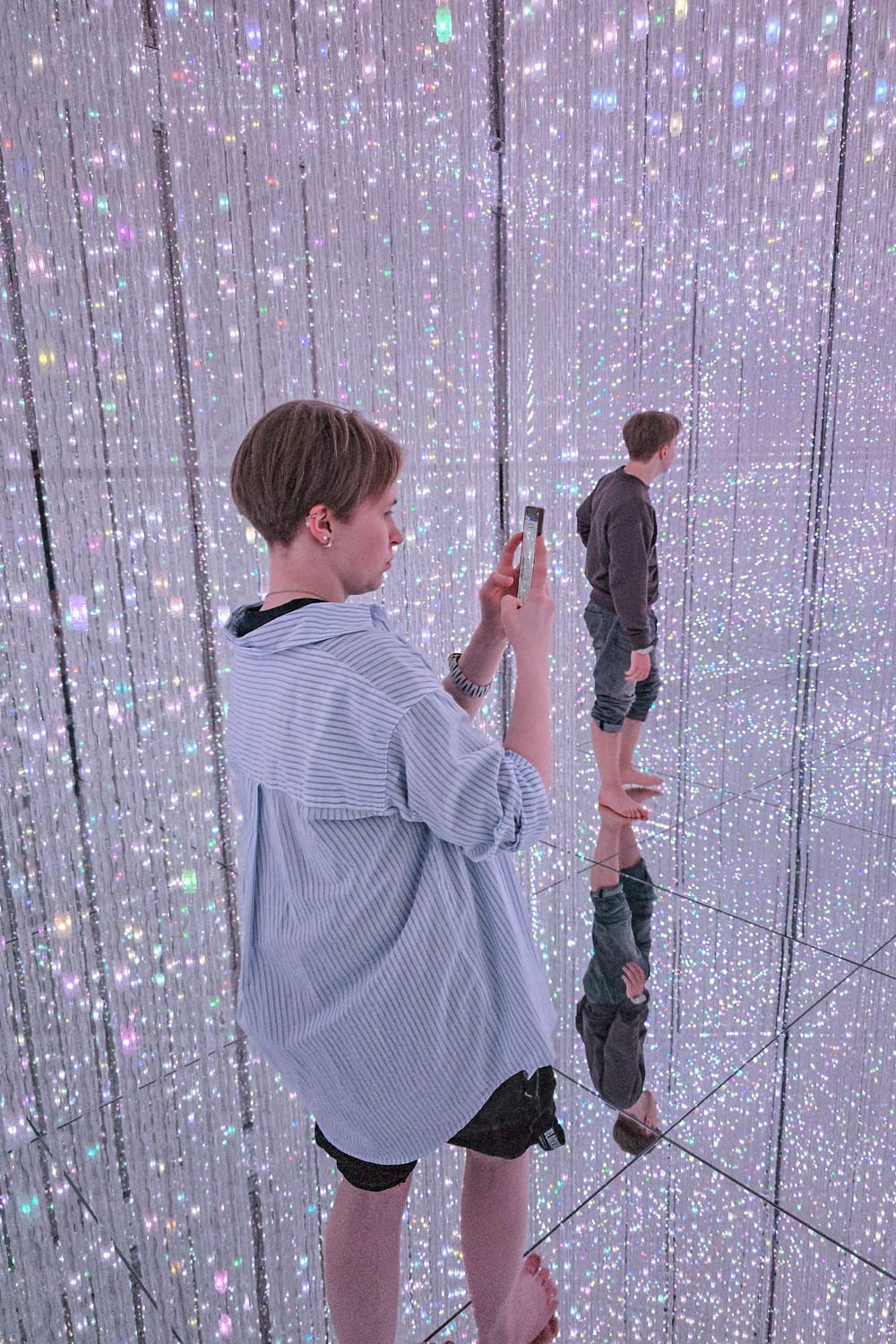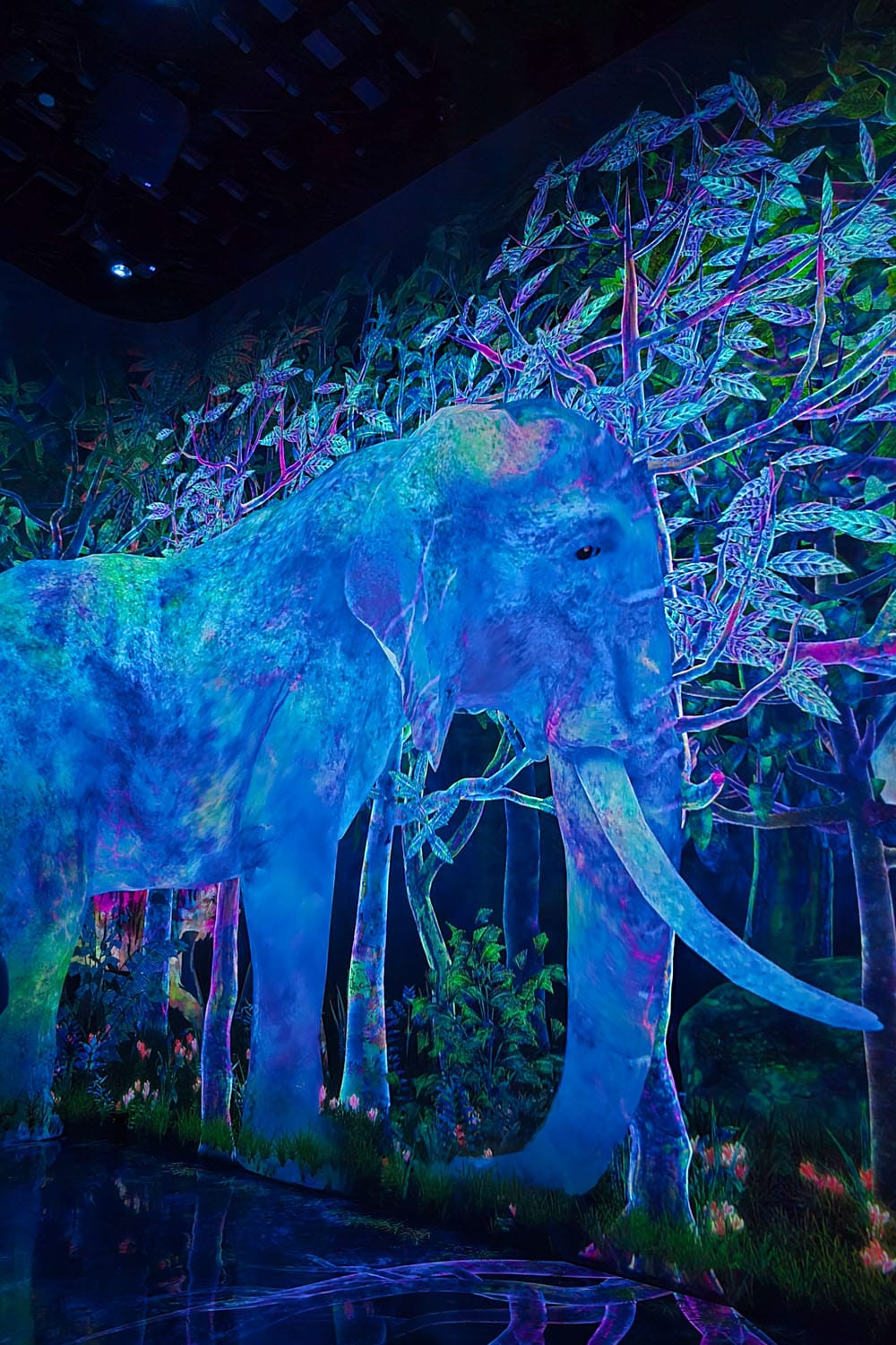 Hämmästyin, miten isosta alueesta on kysymys. Halli on jaettu pienempiin tiloihin, joista jokaisessa on oma teemansa ja interaktiivinen teoksensa. Liikuimme alati muuttuvien kuvioiden ja muotojen keskellä kuin pikkulapset huvipuistossa: laskimme mäkeä, kiipeilimme ja tasapainottelimme. Välillä vaelsimme jättimäisessä viidakossa norsujen ja sarvikuonojen keskellä. Yhdessä hetkessä leikimme valaistuilla jättipalloilla tai seikkailimme epätodellisen peili- ja valoefektien huoneessa. Loppuhuipennuksena riisuimme kengät ja kahlasimme vedessä, jossa jalkojen vierestä uivat sadat valokalat. Ihmeellistä! Oikeastaan koko elämystä on vaikea kuvailla, se pitää itse kokea.