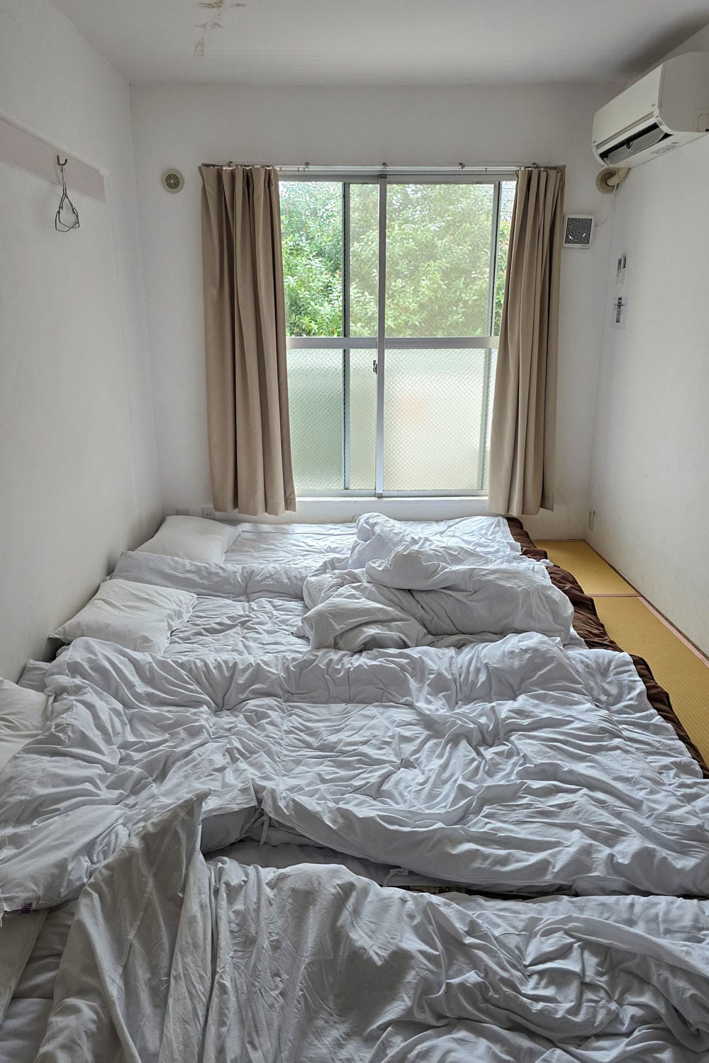Koko matkan viimeiselle yölle meille oli vain yksi tavoite: kunhan löytyy joku luukku suht inhimillisellä hinnalla ja sijainnilla, josta on näppärä sukkuloida illalla lentokentälle ja autoa palauttamaan. Ja kas, Nipporin alueelta löytyi tuo yllä oleva viihtyisä keidas. ;-) Voin kertoa, että tunnelma on korkealla, kun neljä henkilöä majoittuu matkalaukkuineen pikkuriikkiseen huoneeseen ja seitinohuille patjoille. Hintaa yölle Sakura Hotel Nipporissa kertyi 188 euroa. Huoneessa ei ollut vessaa eikä suihkua, vaan peseytymiset ja vessahommat sujuivat yhteisissä tiloissa hostel-tyyliin. Kyllä täällä nyt yksi yö meni, mutta mikään nautinto kokemus ei ollut. Nipporin alue sen sijaan oli todella symppis, täynnä kivoja kauppoja ja kahviloita. Kerron tästä lisää vielä seuraavassa postauksessa.