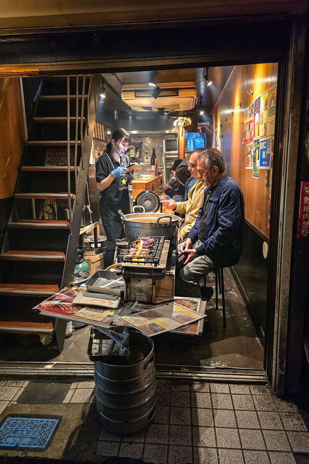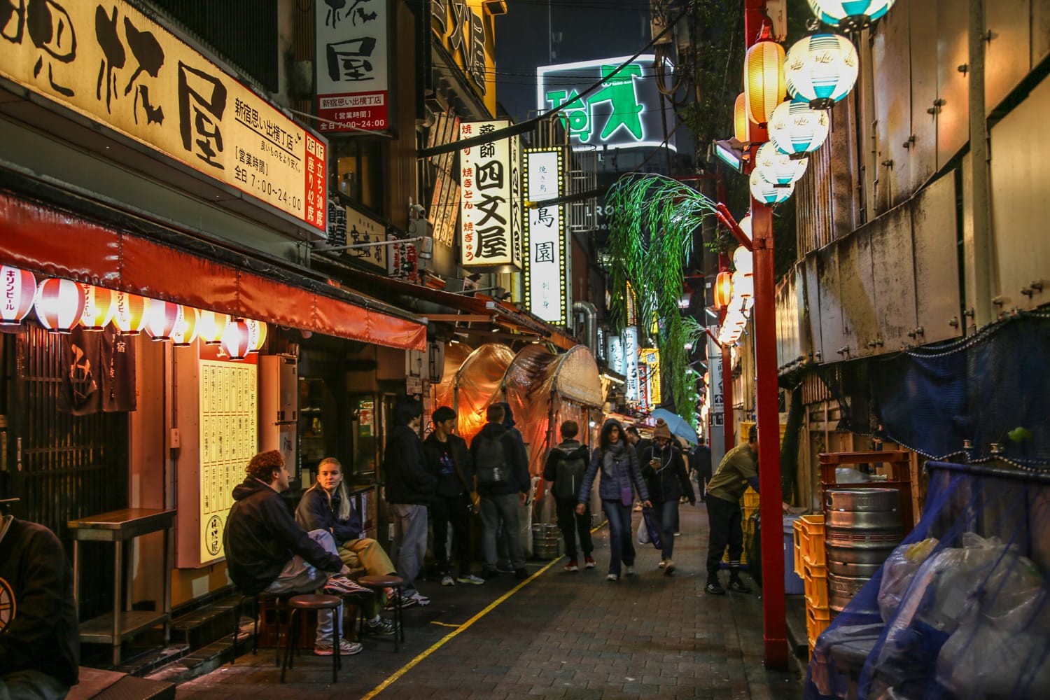 Jos muistat Lost in Translation ja Kill Bill Vol 1 -leffat, Shinjuku Omoide Yokochon kapeat kujat ja rasvantuoksuiset grillit saattavat näyttää tutuilta. Molempien leffojen kohtauksia on kuvattu juurikin näissä kortteleissa. Vaikka paikka on usein täynnä turisteja, alue on säilyttänyt yllättävän hyvin autenttisuutensa. Me sukkuloimme Shinjuku Omoide Yokochossa pienessä vesisateessa illalla, joten fiilis oli jotenkin aivan erityinen. Savu puski ulos pienistä kojuista ja bonbori-lyhdyt huojuivat tuulessa. Pääkujalla on mittaa vain 200 metriä ja kuppiloita mahtuu matkalle kymmeniä. Ravintoloihin ei tehdä etukäteisvarauksia, vaan paikat täytetään saapumisjärjestyksessä. Asiakkaat istuvat baaritiskin ääressä ja chef käristää parilalla yakitoria (liha- ja kanavartaita), motsuyakia (sisäelimiä) tai gyoza-nyyttejä. Herkut nautitaan oluen tai saken kanssa.