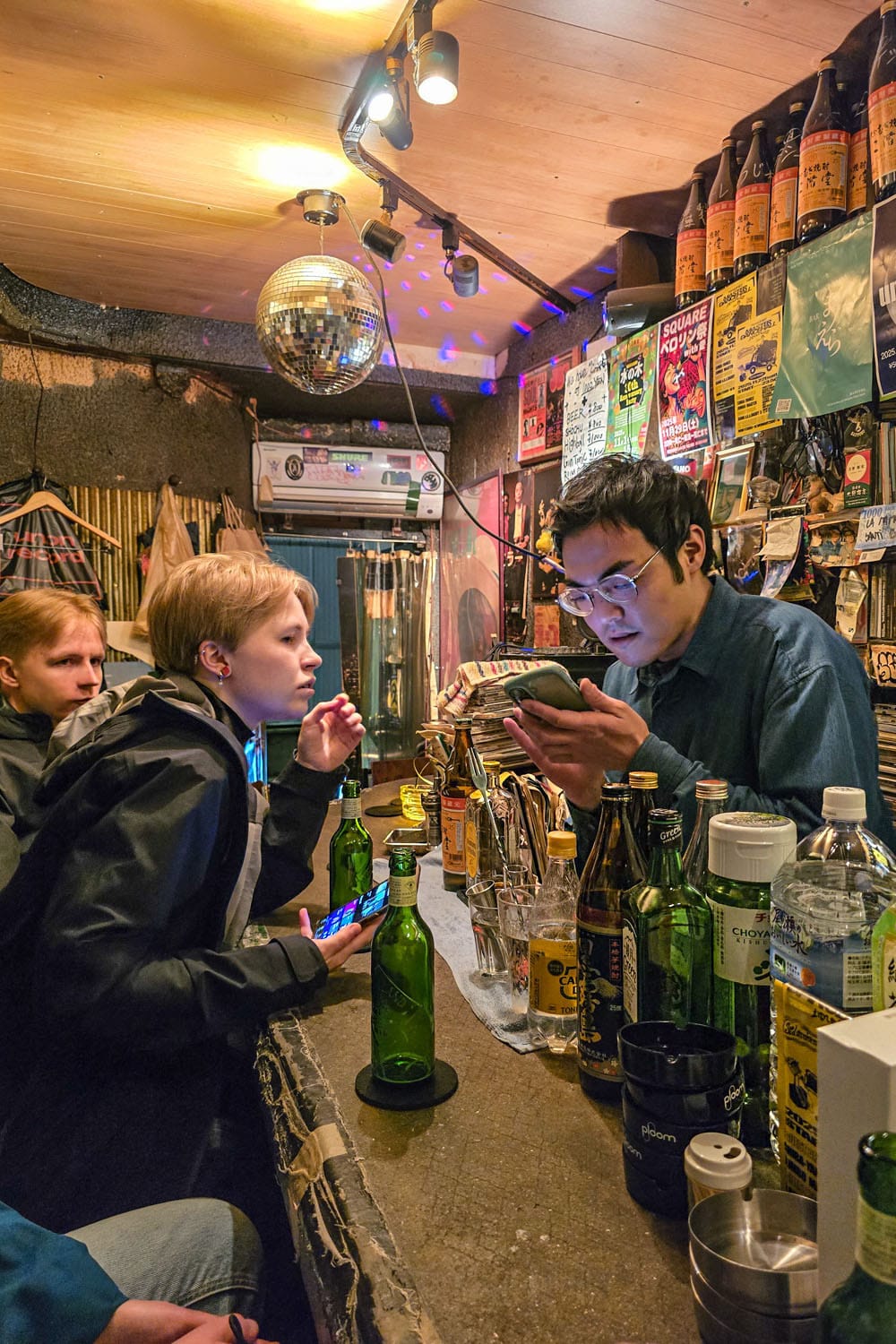Kun vatsat olivat täynnä, suuntasimme Golden Gain baarikortteleihin, jotka sijaitsevat myös Shinjukussa, Kabukichossa. Tämä alue kannattaa käydä ainakin kävelemässä läpi, vaikkei baarissa istuskelu huvittaisikaan. Kuudelle kapealle kujalle on sullottu yli kaksisataa minibaaria, joihin pääsee kurkkimaan sisään avoimista ovista. Välillä kadulle raikaa japanilaisten rakastama karaoke, toisinaan äänekäs puheensorina. Tunnelma on intiimi, sillä usein kuppiloissa on vain muutama paikka tiskin ääressä. Baarimestarit sekoittelevat drinkkejä, hörppivät itsekin työn lomassa hiukan sakea ja toimivat dj:nä. Meillä oli täällä mahtavia kohtaamisia, ja Anni (tytär) pääsi puhumaan japania sydämensä kyllyydestä. Monet paikat ovat auki aamutunneille saakka.