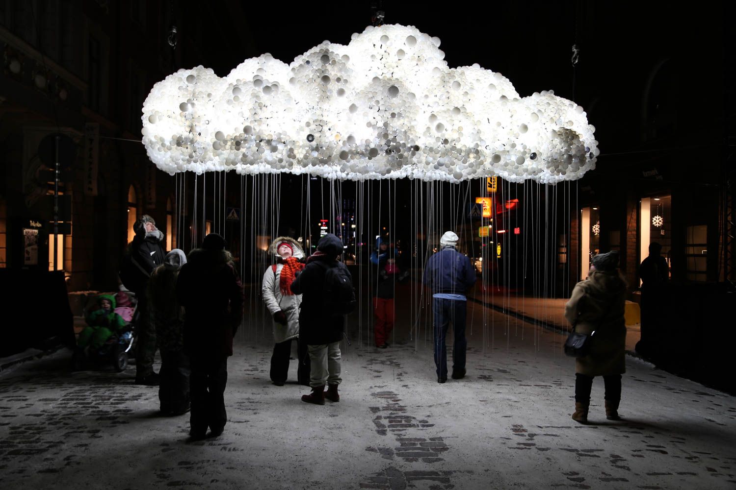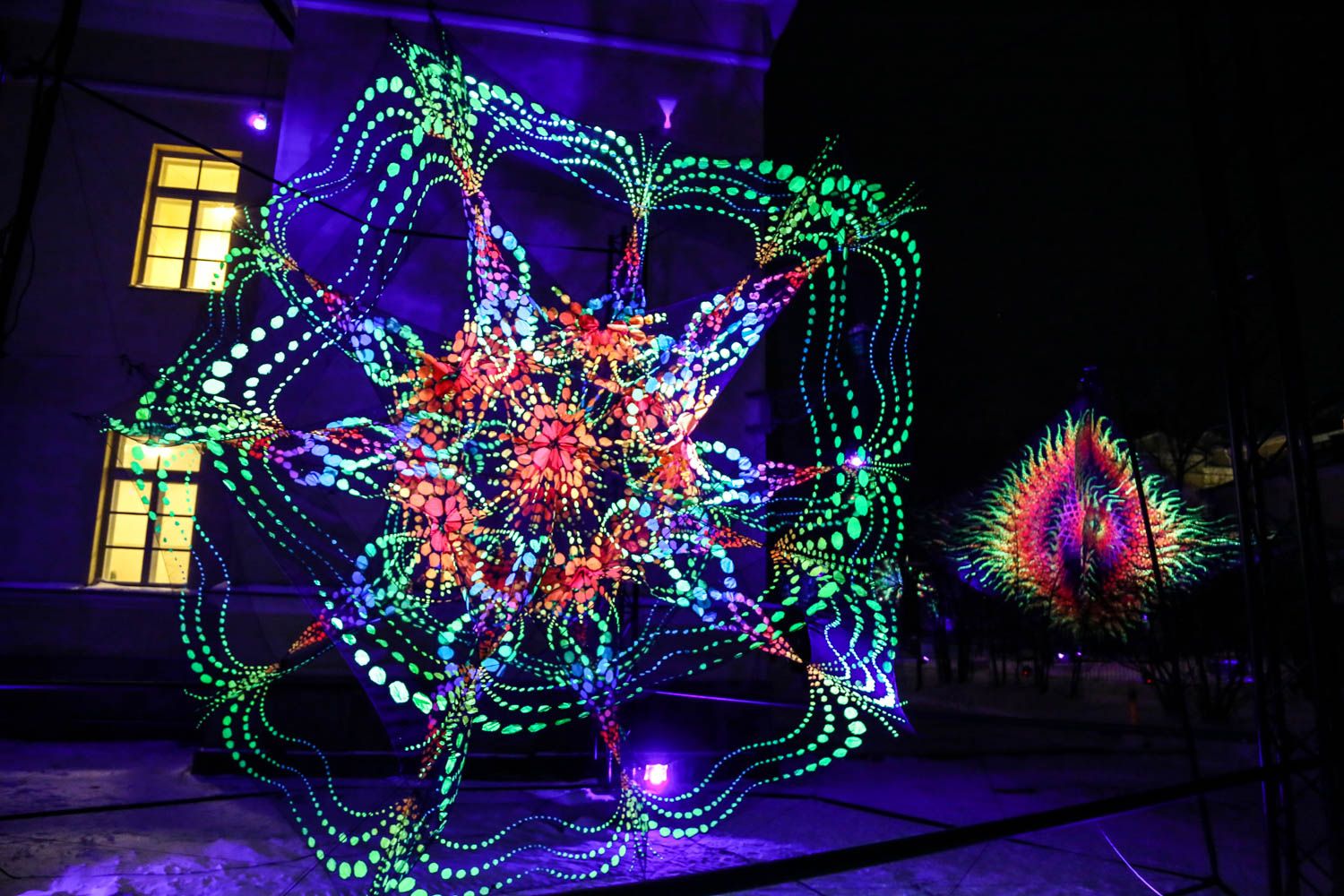 "Pakkanen ei ole niin paha, mutta lämpötilanvaihtelut ja varsinkin kosteus aiheuttavat haasteita. Tässäkin olemme kuitenkin tulleet kokemuksen myötä viisaammiksi. Tuomme jo tapahtuman kokoamisvaiheessa paikalle lämpimät kontit, joissa sekä piuhat että teosten rakentajat pysyvät kuivina. Kova pakkanen ja tuuli aiheuttavat tietysti eniten haasteita kävijöille."