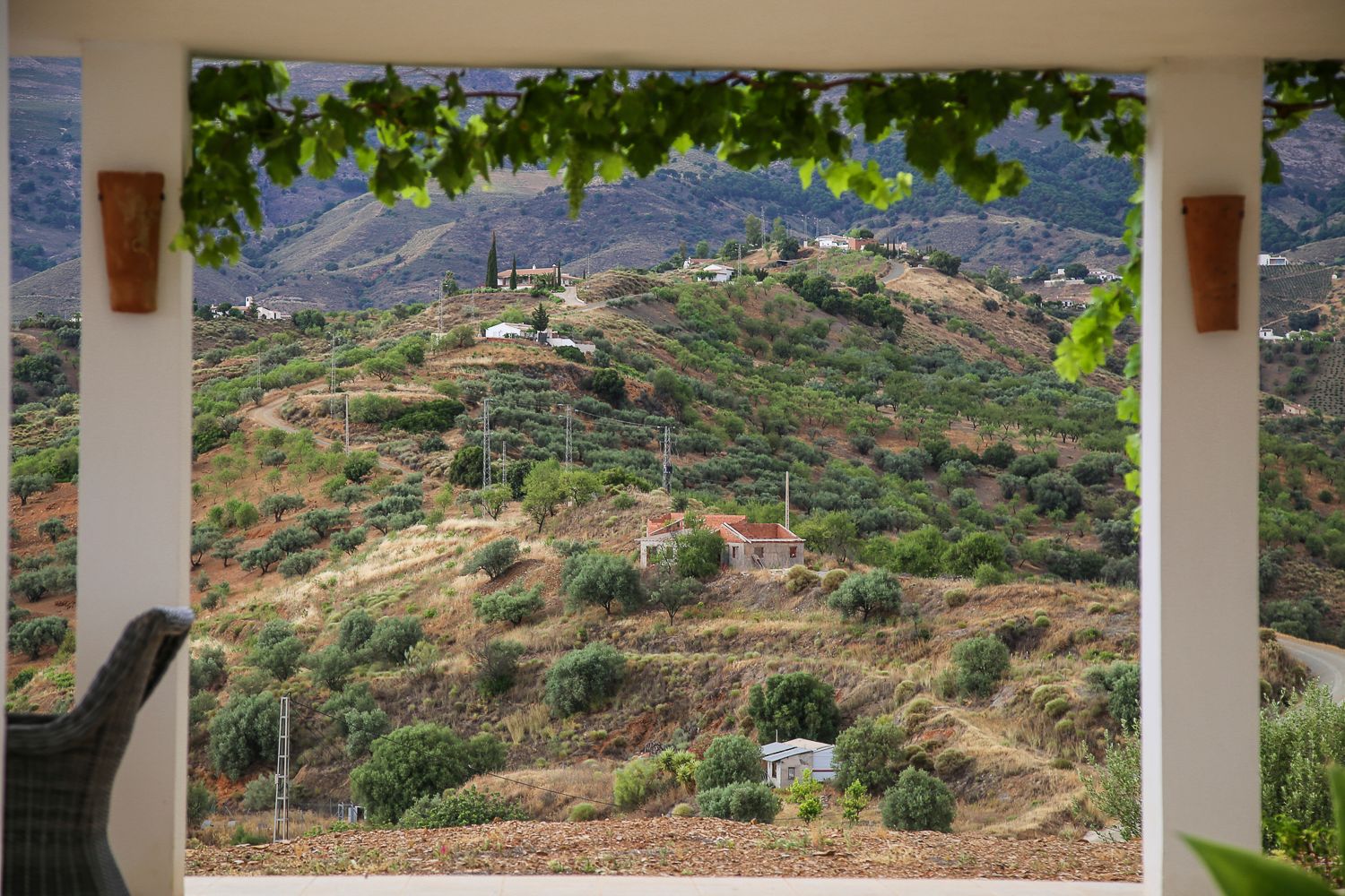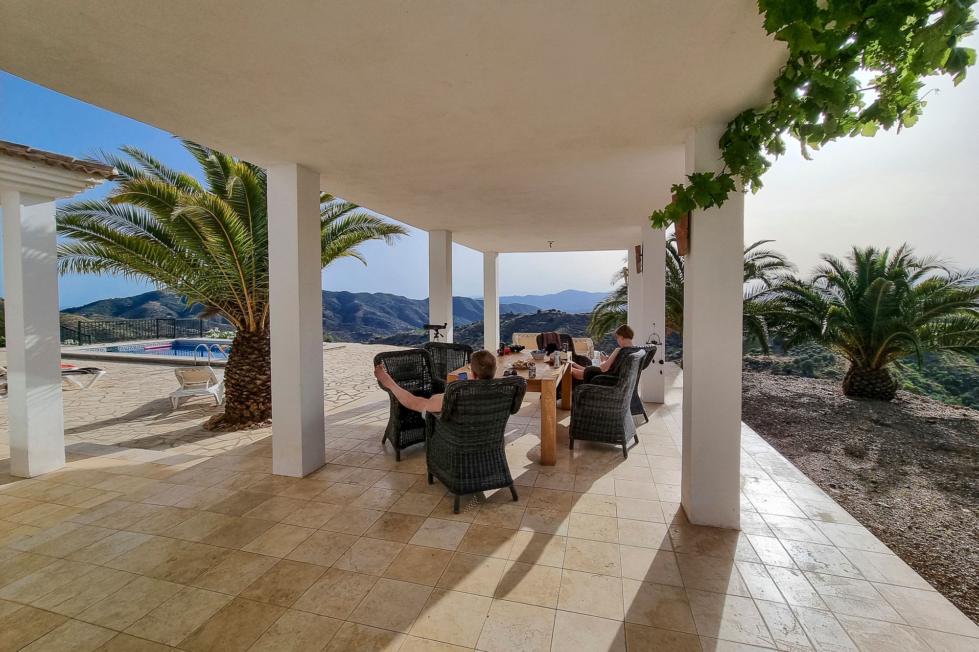 Koska talo on rakennettu kukkulan päälle, näkymät ovat vertaansa vailla. Vaikka pihalle on istutettu palmuja sekä hedelmä- ja mantelipuita, ne eivät blokkaa näkymää, vaan joka puolelta avautuu huikea vuoristomaisema. Tuota yllä olevaa postikorttia ihastelimme joka päivä syödessämme terassikatoksen alla aamiaista tai illallista. Taustalla kohoaa La Maroman vuori, jonka huippu on reilussa kahdessa kilometrissä.