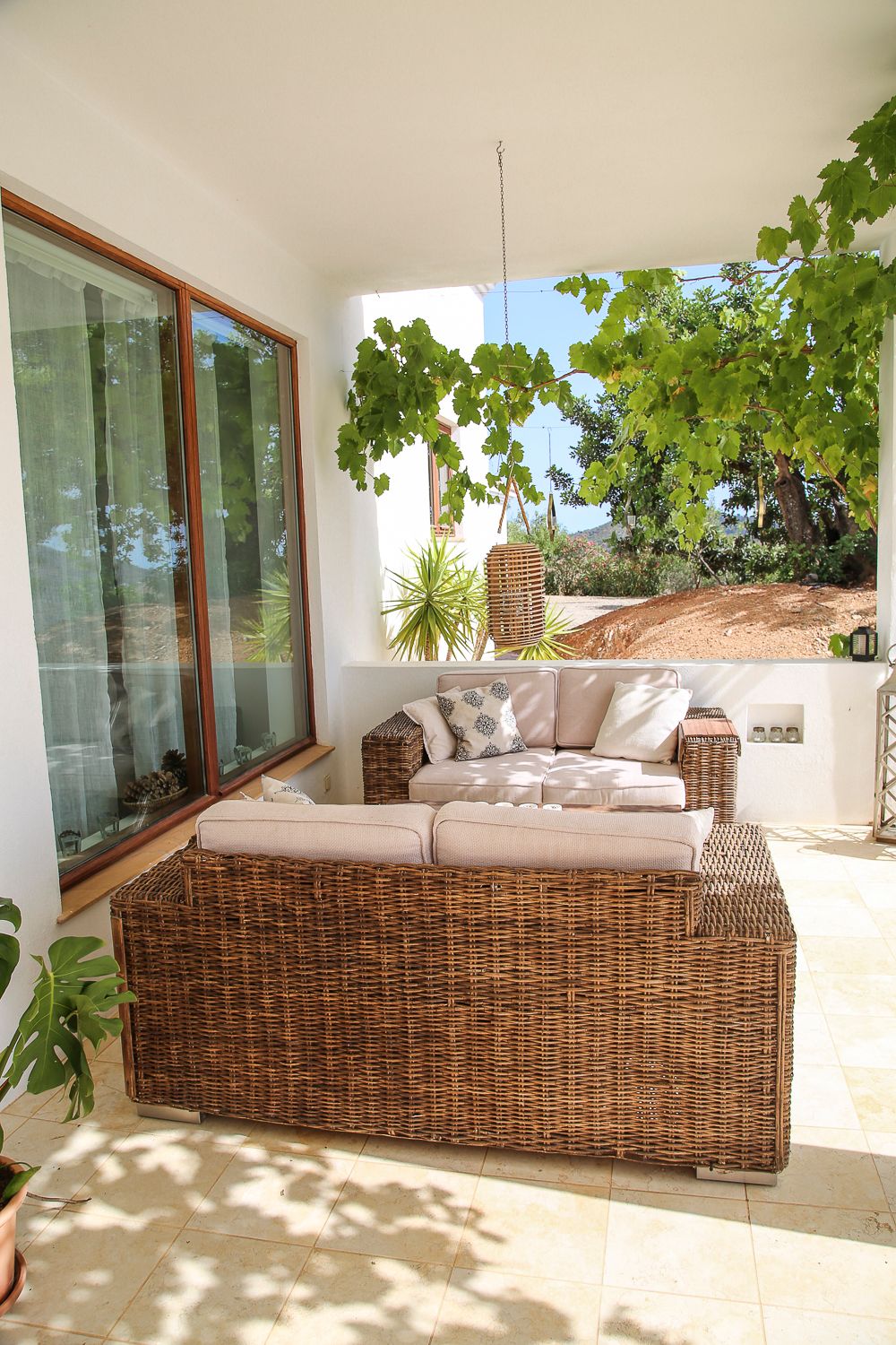 Kiva idea talossa on myös sataneliöinen terassi, joka suojaa paahteelta. Katoksessa puhalteli aina vilvoittava tuuli, joten tässä oli kiva istuskella kuumanakin päivänä. Karina ja Dan toivoivat, että voisimme kastella ruukkukasveja lomaviikkomme aikana, eikä minulla ollut mitään sitä vastaan. Puutarhassa kasvaa yrttejä, pieniä sitruunapuita, viiniköynnöksiä ja kukkia.