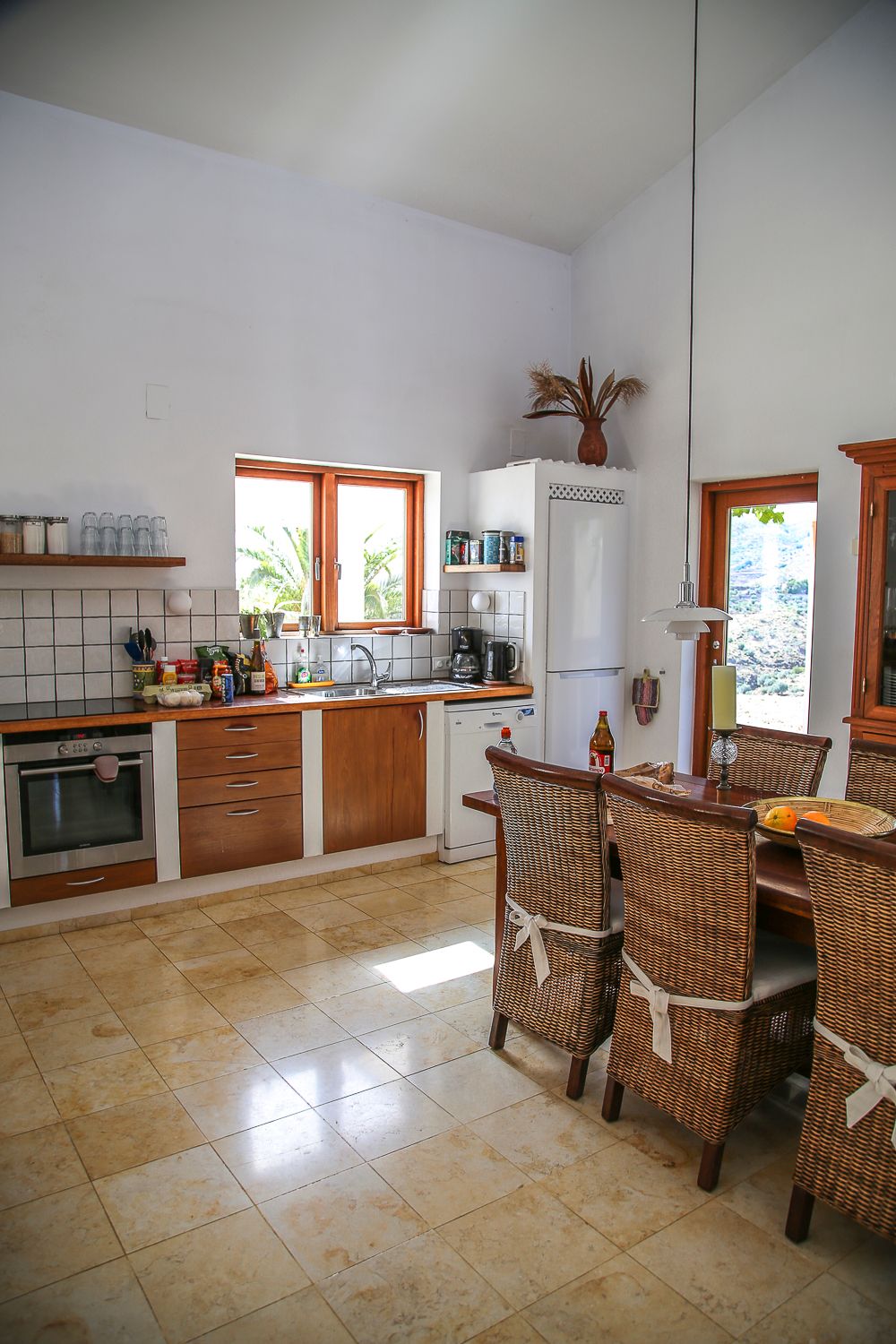 Olemme yöpyneet kymmenen vuoden aikana niin monissa Airbnb-kodeissa, että huomaan aika nopeasti, ovatko ne sijoittajien asuntoja vai oikeasti asumiskäytössä. Casa Karinasta näki heti, että omistajat ovat rakentaneet talon itselleen ja myös viettävät täällä aikaa. Keittiö on hyvin varusteltu: monipuolisen astiavalikoiman lisäksi kaapeista löytyi mausteita, jauhoja ja pastaa. Kiertoilmauuni, astianpesukone ja terassin grilli helpottivat kokkailua ja sitä harrastimmekin täällä paljon. Vaikka Sedellan kylään oli vain kymmenen minuutin ajomatka ja Canillas de Aceitunon kyläkin oli ihan vieressä, kävimme syömässä ravintolassa vain kerran ja kokkailimme muuten ruuat itse. Se oli aina kiva yhteinen ohjelmanumero leppoisan päivän päätteeksi.