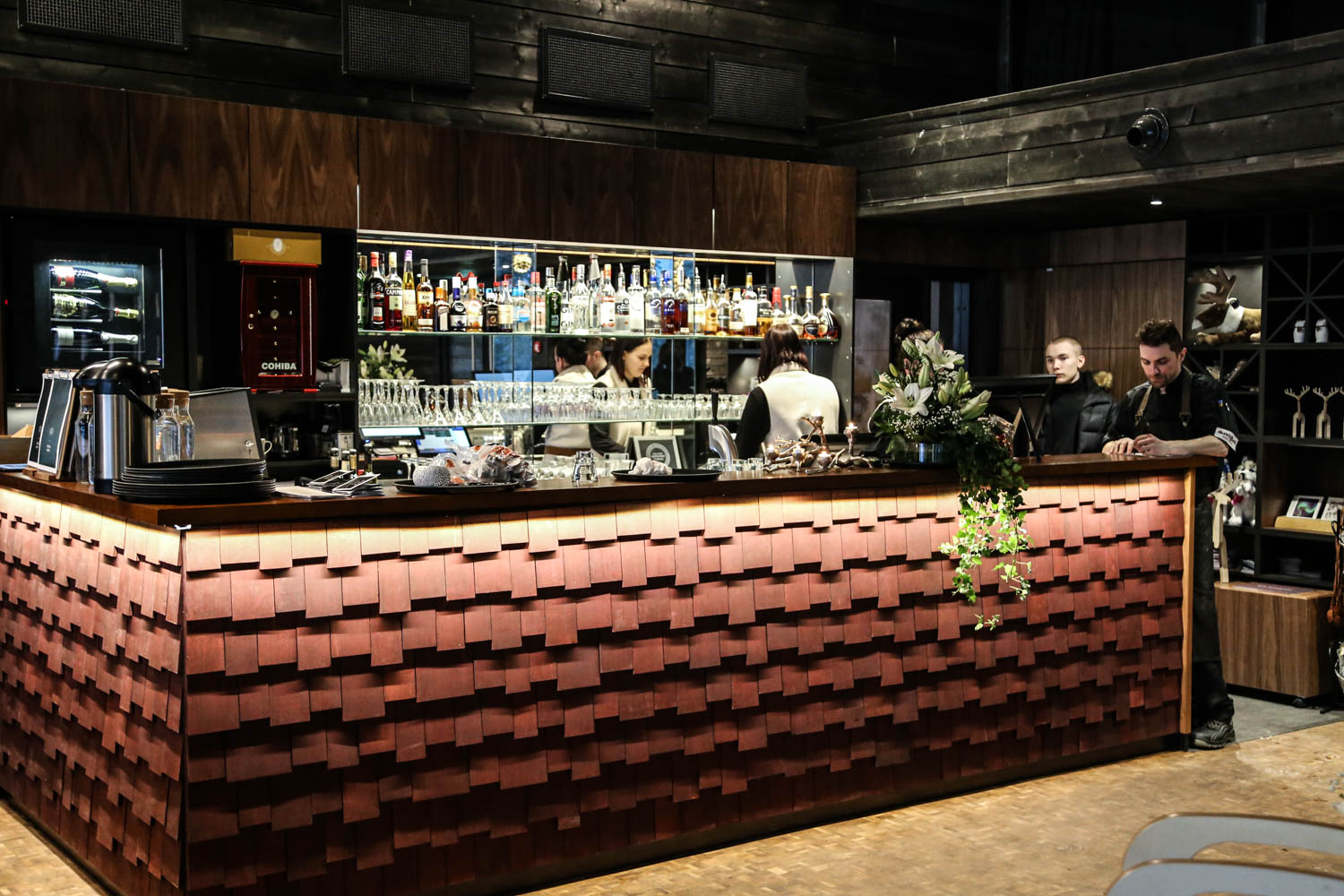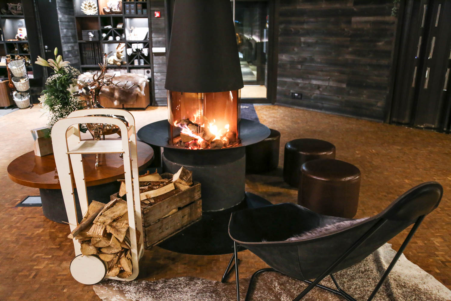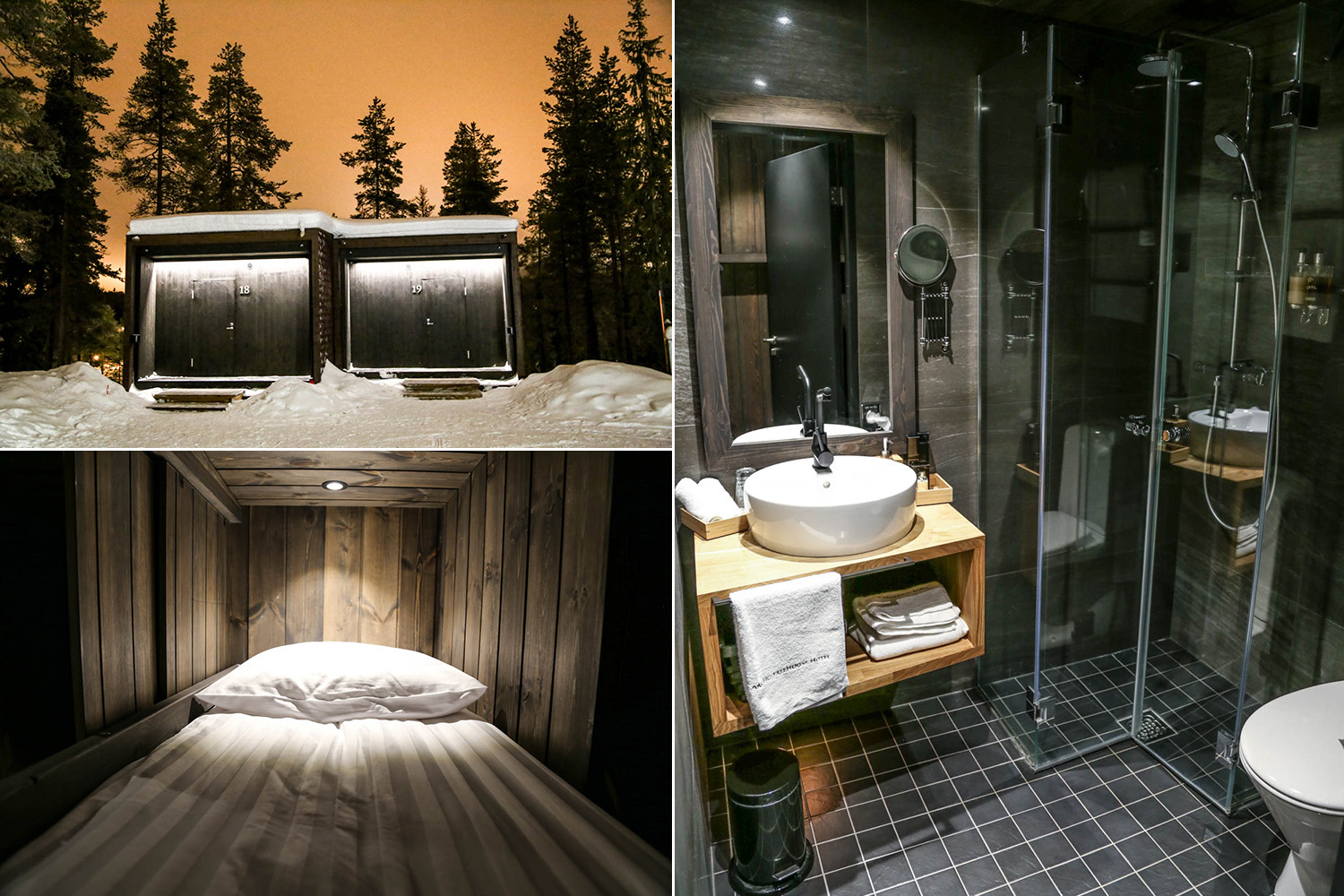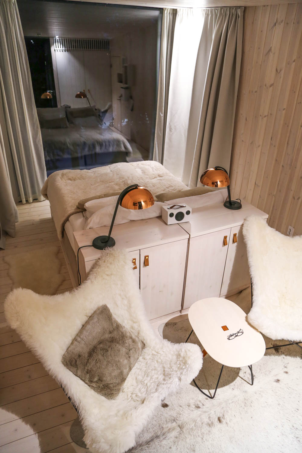 Suomalaisen silmin käpylehmät ovat varsin simppeleitä. 27-neliöisten majojen sisäseinät on tehty kuultomaalatusta puupaneelista, jota löytyy monen kesämökiltäkin. Luksusvaikutelmaa tuovat taljoilla päällystetyt lepakkotuolit ja design-lamput. Suurimman vaikutuksen ainakin minuun teki koko päätyseinän kokoinen ikkuna, josta avautui huikea näkymä lumiseen metsään. Voisin kuvitella, että maisema on varsinkin kesällä yöttömän yön aikaan melkoinen elämys ulkomaisille turisteille.