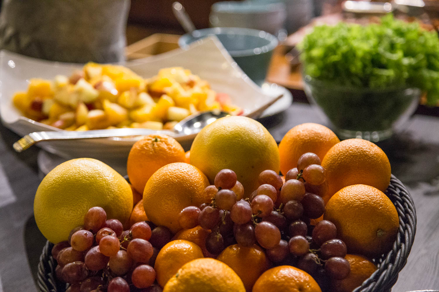 Aamiainen oli runsas: hedelmiä, tuoreita marjoja, juureen leivottua leipää ja laadukkaita leikkeleitä.